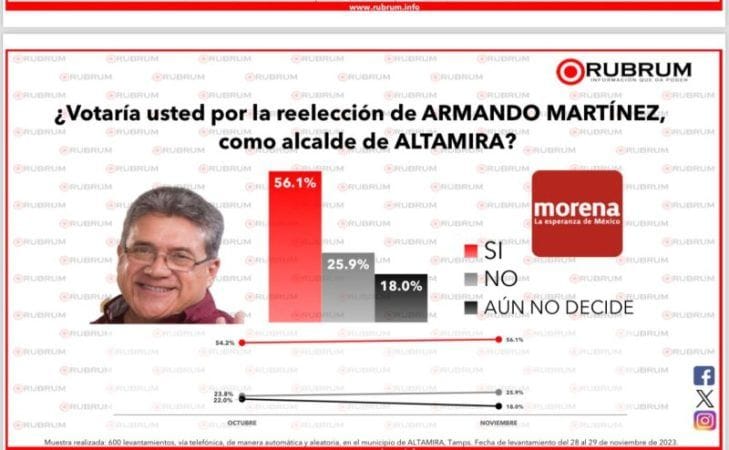 La encuesta realizada vía telefónica refirió: ¿Votaría usted por la reeleción del alcalde de su entidad?; resultando Armando Martínez Manríquez con el 56.1 por ciento de aprobación para continuar al frente del municipio camino al proceso electoral de 2024.