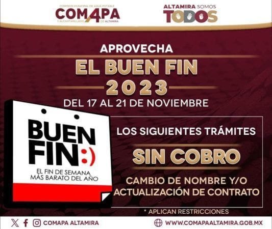 Apoyando la economía de los altamirenses, la Comisión Municipal de Agua Potable y Alcantarillado de Altamira se une al Buen Fin 2023, que se estará desarrollando del 17 al 21 de noviembre, ofreciendo atractivas promociones que incluyen la condonación de pagos en trámites, además de importantes descuentos en los diferentes programas que maneja el organismo.