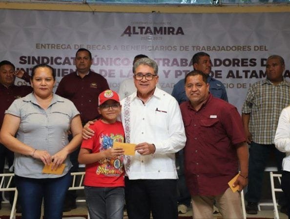 El alcalde de Altamira, Dr. Armando Martínez Manríquez, encabezó la entrega de becas educativas a los hijos de trabajadores sindicalizados del Ayuntamiento, ratificando su compromiso con los acuerdos establecidos en el contrato colectivo de trabajo.